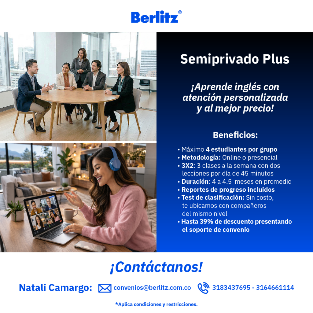 Descuento especial ¡Descubra cursos de idiomas con Berlitz y escoja el suyo! Ajustado a sus necesidades en el idioma y su profesión. Metodología 100% conversacional. Horarios flexibles en cursos presenciales, virtuales y personalizados. Ver más… AFILIACIÓN Aproveche los convenios y espacios que tenemos para usted. Participe activamente en nuestros proyectos y actividades. Afíliese y pague desde la comodidad de su casa en solo dos pasos. AFÍLIESE AQUÍ